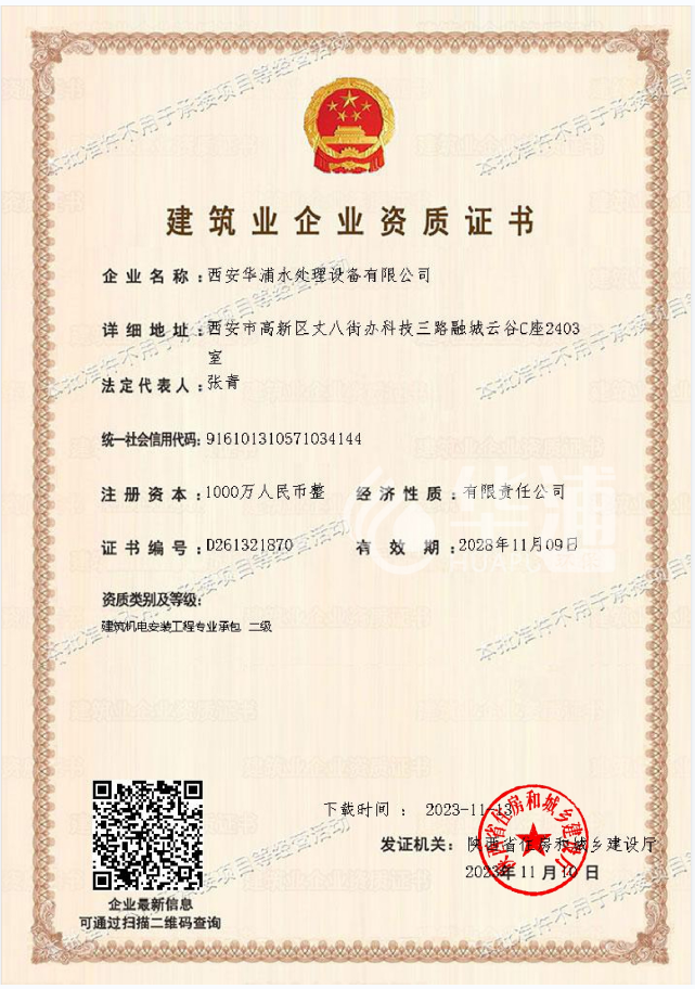 近日,西安華浦環(huán)保水處理設(shè)備有限公司建筑機(jī)電安裝工程資質(zhì)升為二級。此次資質(zhì)等級的提升,使我司資質(zhì)等級和專業(yè)水平又上了一個(gè)新臺階,進(jìn)一步增強(qiáng)了公司的市場競爭能力,為公司做大做強(qiáng)打下了堅(jiān)實(shí)的基礎(chǔ)。
