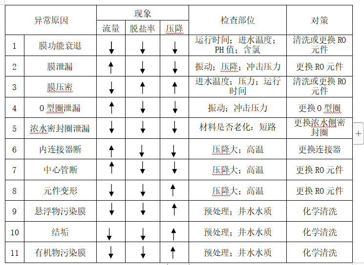 (1)裝置運行時如出現以下任一情況,則必須立即進行化學清洗。(在標準條件下,即壓力1.5MPa, 水溫25℃, 回收率75%)