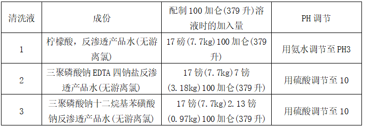 (b) 清洗液最高溫度為30℃,最高壓力為3.5kg/cm2,每一段清洗時間為45分鐘,用反滲透產水或無離子水配制溶液,溶液混合要均勻。