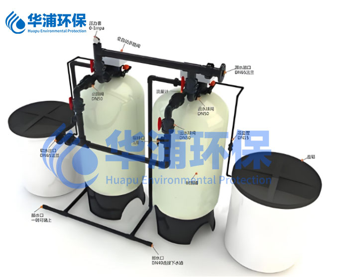 全自動軟化水處理器主要由樹脂罐、全自動多路控制閥和鹽箱三個主要部分組成。樹脂罐內裝填離子交換樹脂,用于吸附水中的鈣、鎂離子;多路控制閥是軟化水處理設備的控制器,控制系統自動完成運行、再生、清洗、排污以及鹽箱補水的循環過程。鹽箱則用于儲存食鹽,以便在樹脂再生時使用。